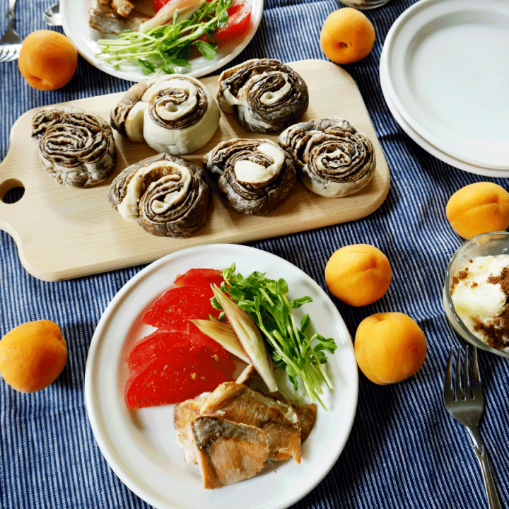 BREAKFAST bkf = two kind of bread, Koyadofu dried tofu and Enoki mushroom soup..