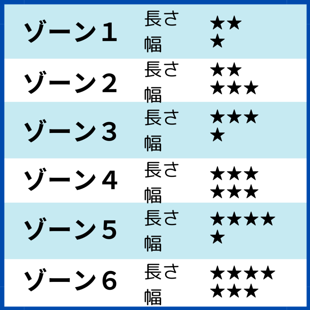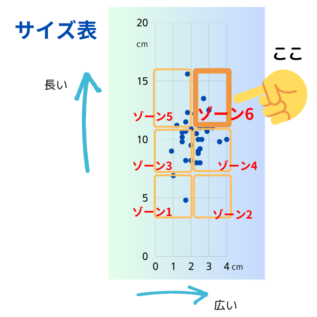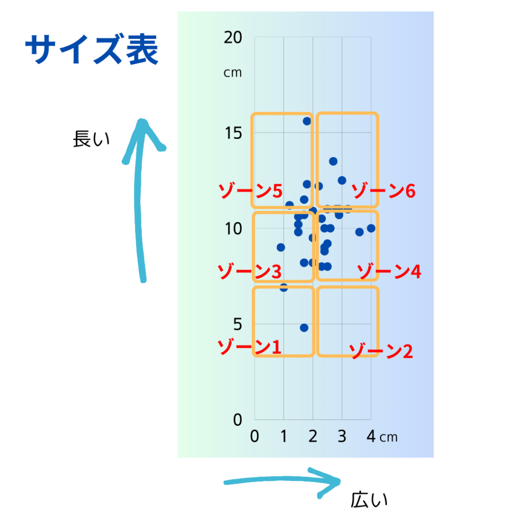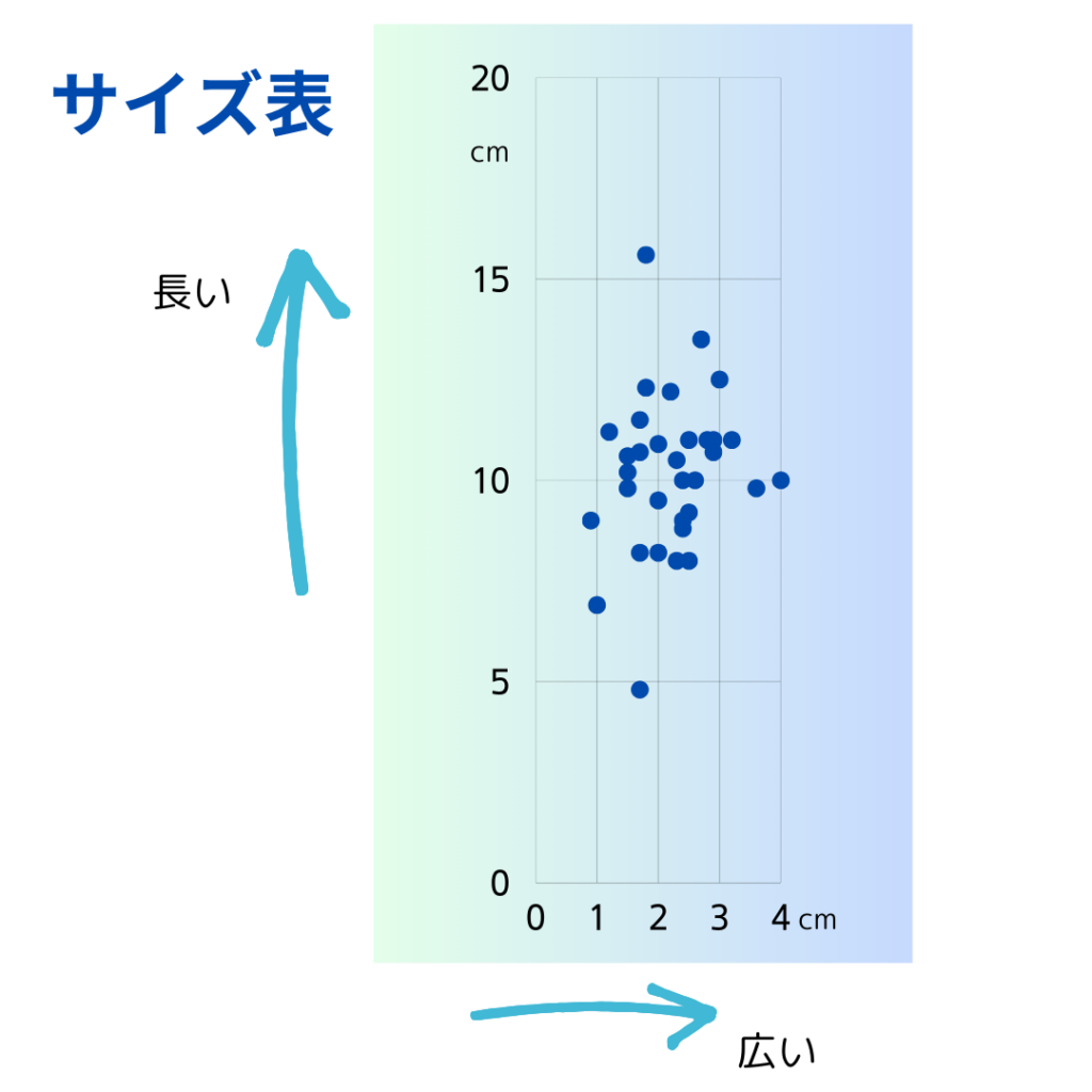 表の上にあるものほど長く、右にあるものほど幅が広いです。