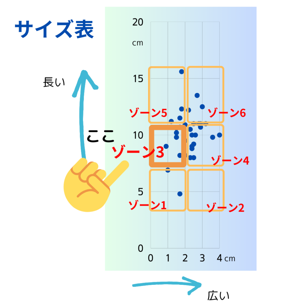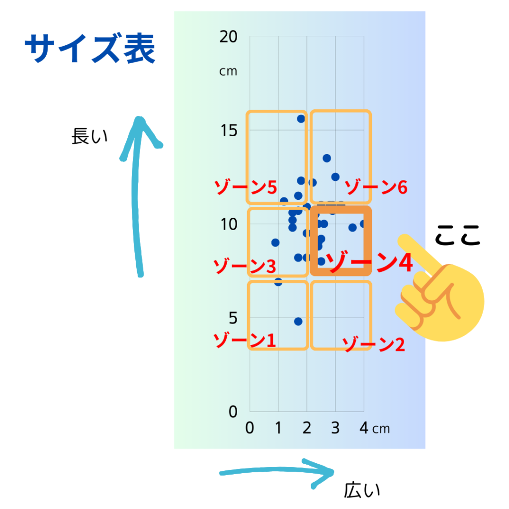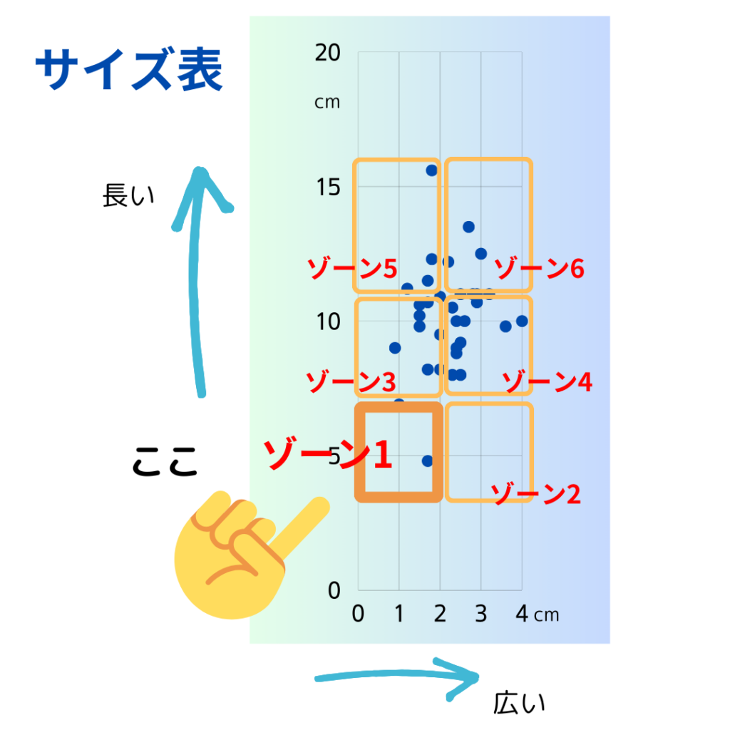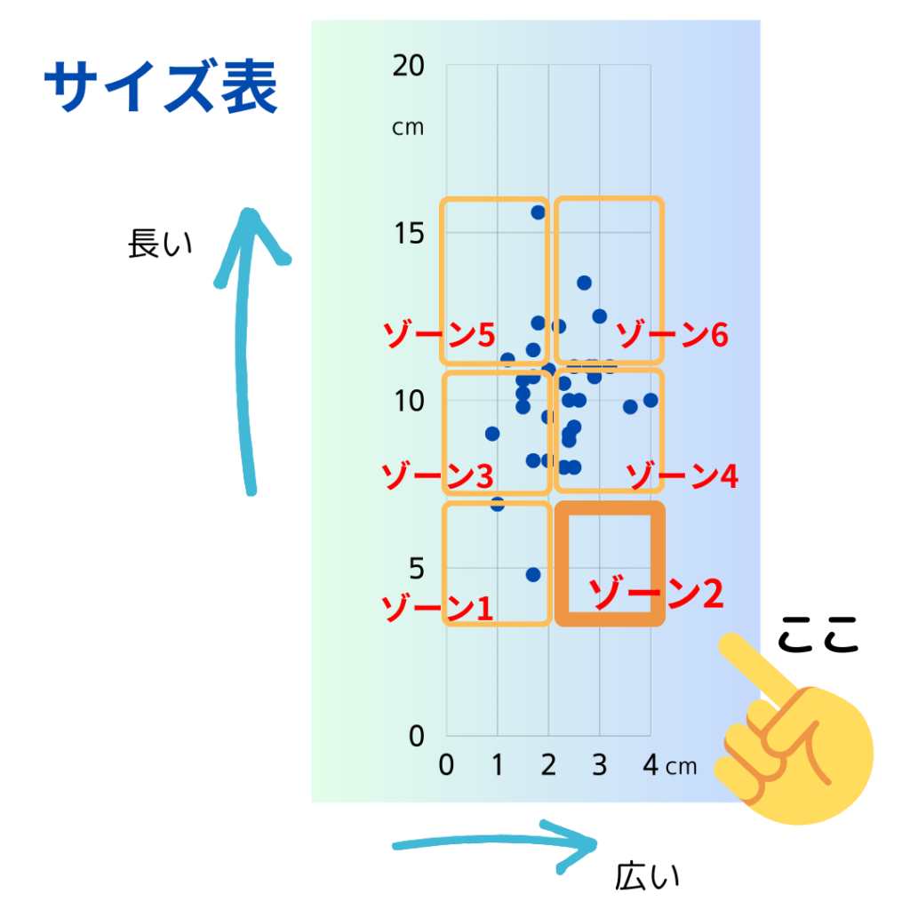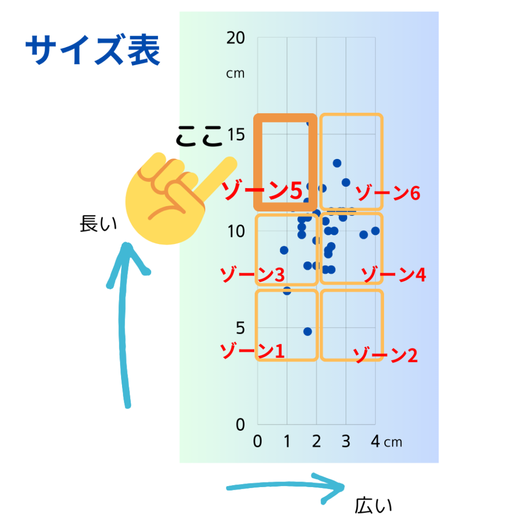 表の上にあるものほど長く、右にあるものほど幅が広いです。