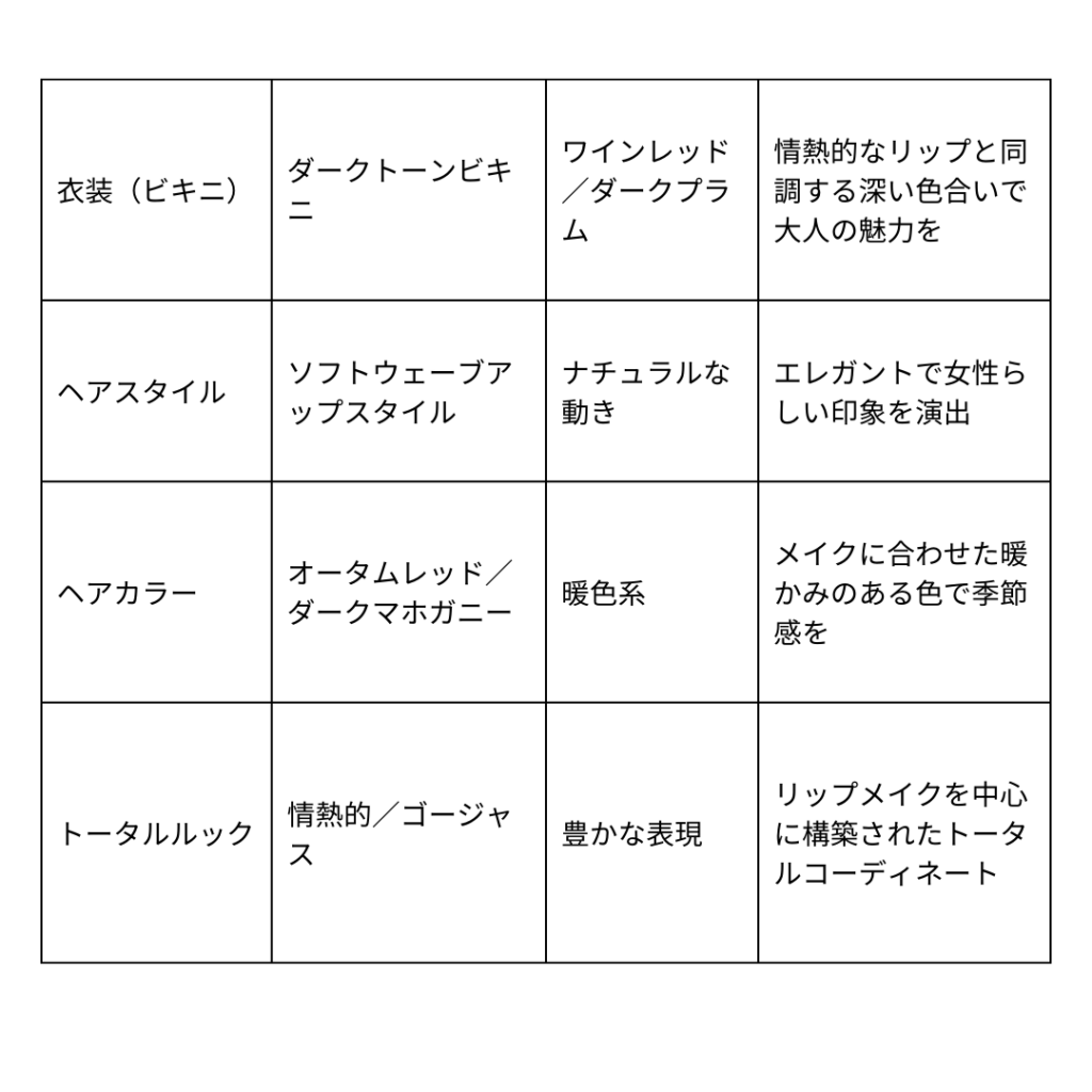衣装(ビキニ): ワインレッドやダークプラムのビキニを選ぶと、リップカラーと同調して、シックで大人っぽい雰囲気に。