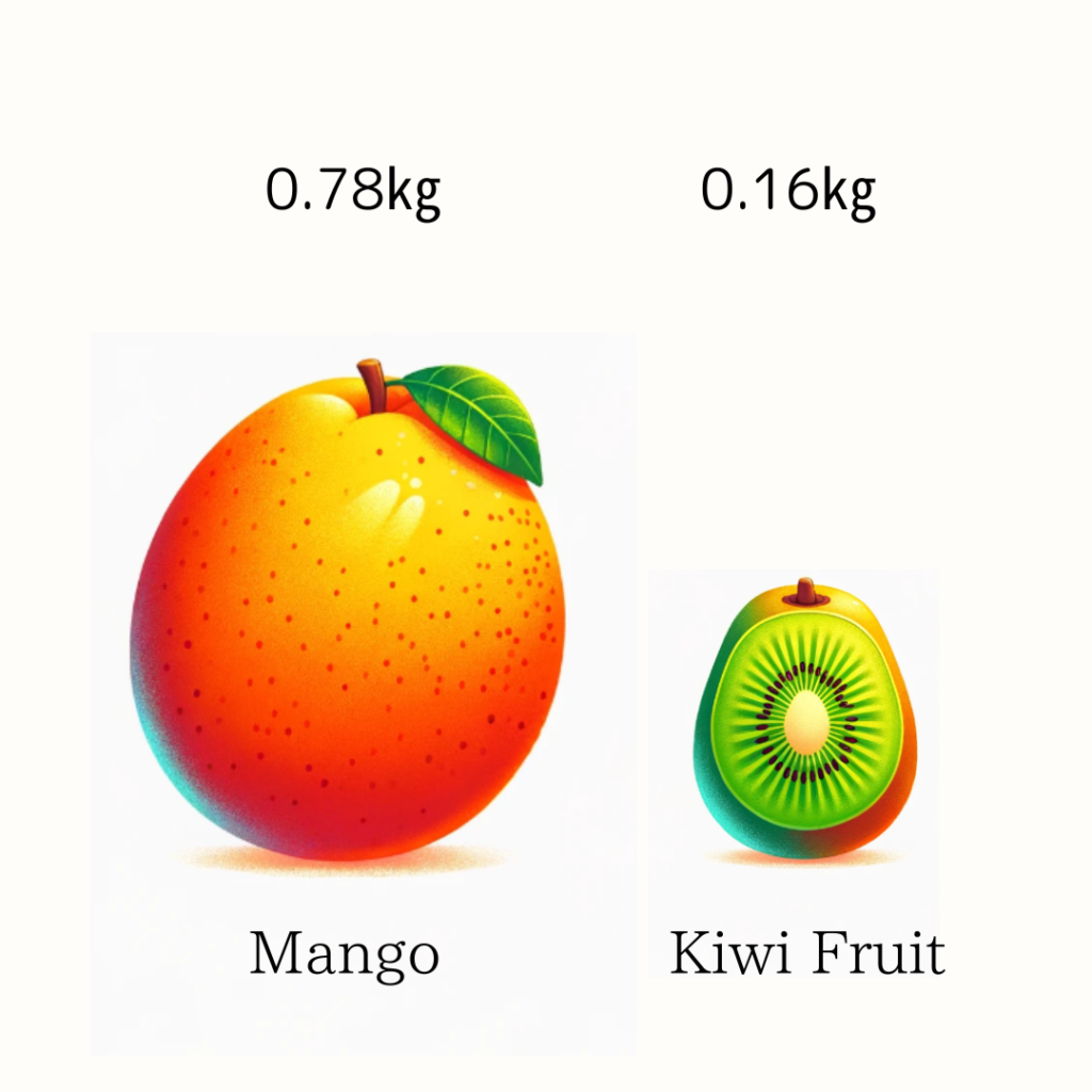 こちら、分かりやすく、上の表の首から上の体脂肪量をそれぞれフルーツの重さで表現したもの。減量前はマンゴ1個分の脂肪量(0.78 ㎏)がキウィ1個分(0.16 ㎏)に減るってことだよ。結構な差だよね。