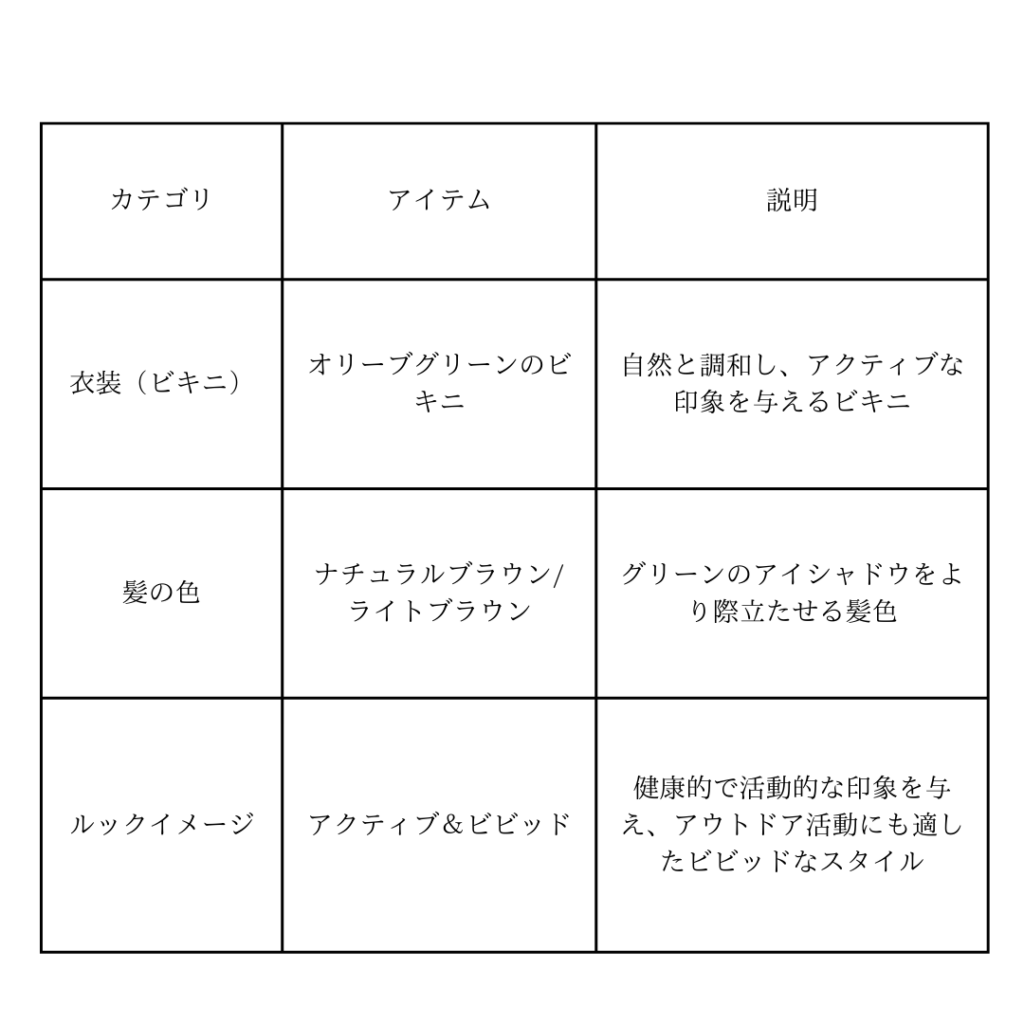•衣装(ビキニ): オリーブグリーンのビキニで、自然と一体になるようなルックに。