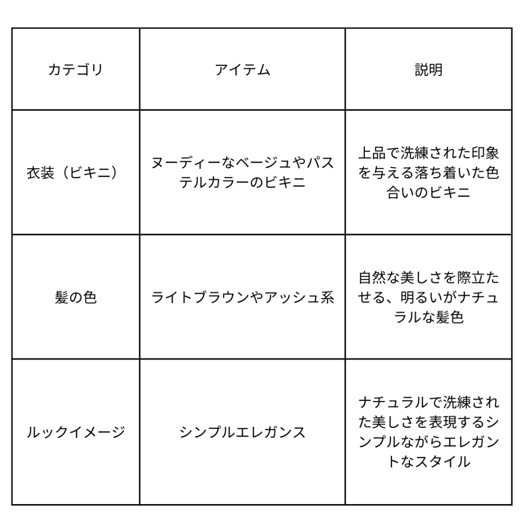 ビキニ: ヌーディーなベージュやパステルカラーで上品な印象に。