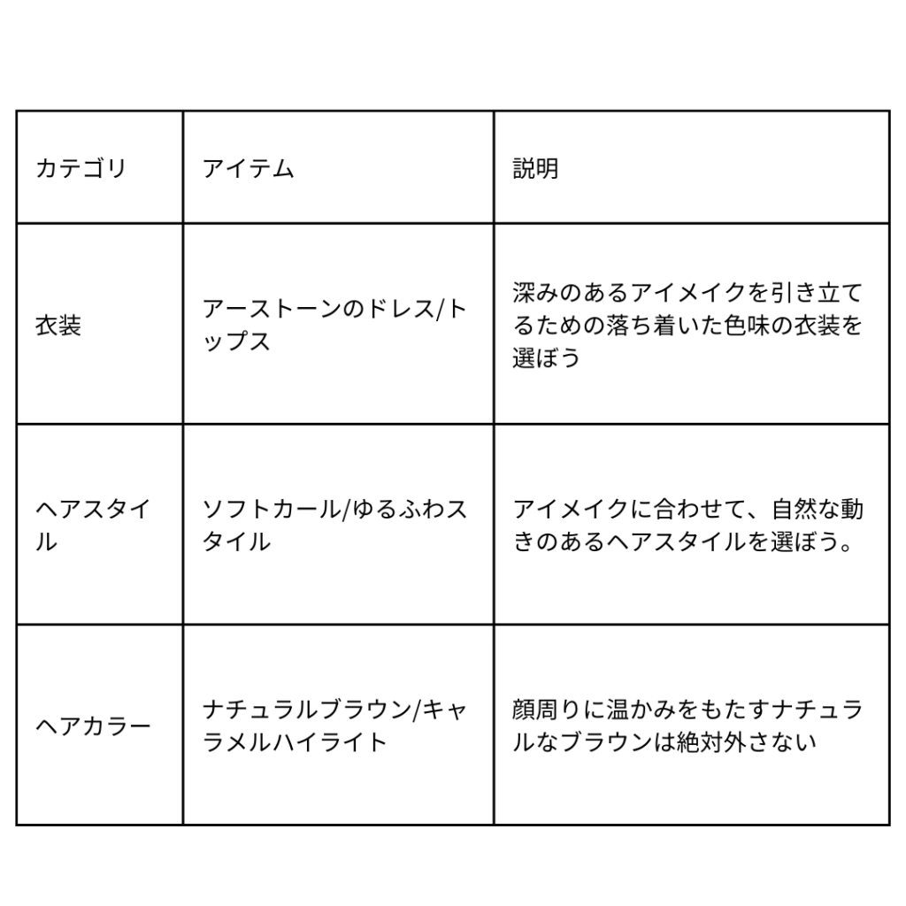ヘアスタイル :髪色: ソフトなカールやゆるふわのヘアスタイルがこのアイメイクにぴったり。ヘアカラーは、ナチュラルなブラウンやキャラメルハイライトを加えるといいよ。
