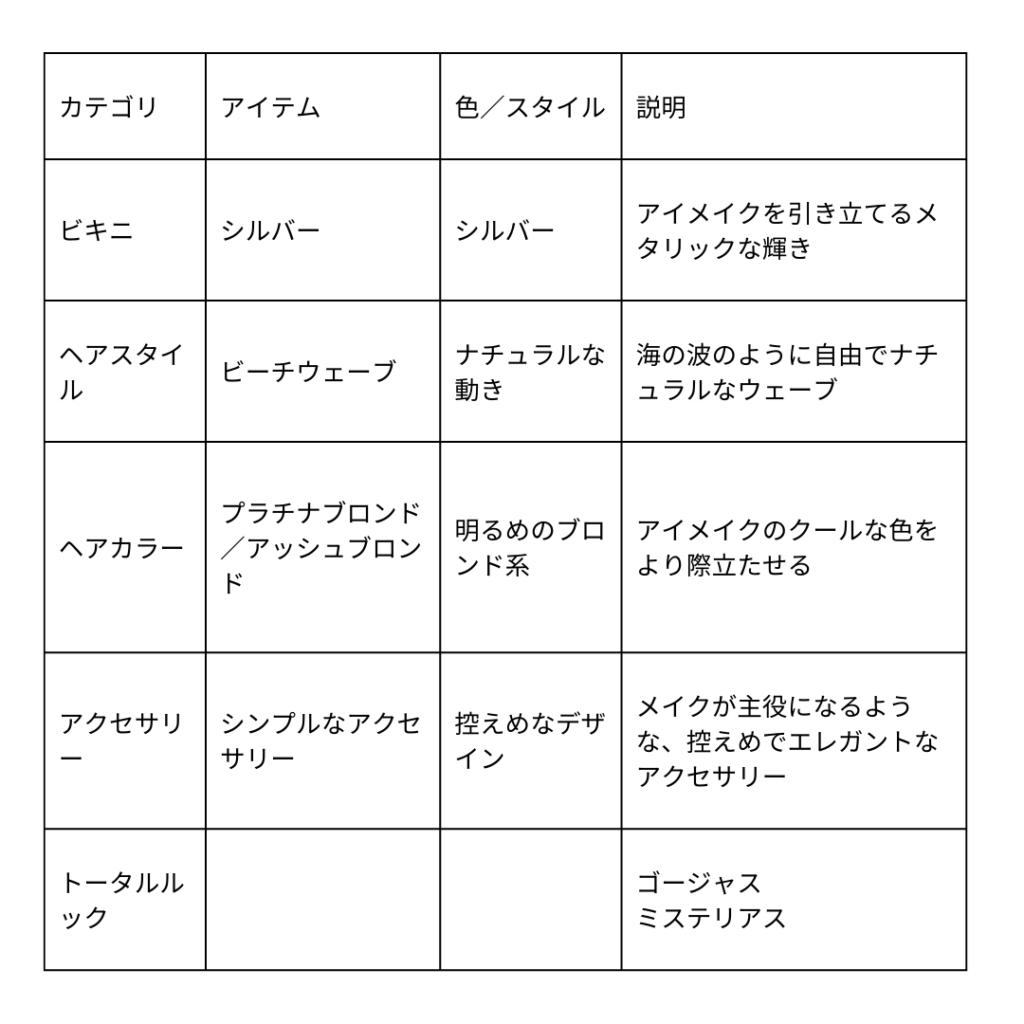 トータルルックでさらにその美しさを引き立てるわ。海の色をテーマにしたメイクには、シルバーのビキニが最高に映える。そしてヘアは、波のようにゆるやかに動くビーチウェーブが理想的。ヘアカラーは、プラチナブロンドかアッシュブロンドが、このアクアブルーのアイメイクをより引き立ててくれるわ。アクセサリーはシンプルにして、メイクとトータルルックのバランスを大切にして。