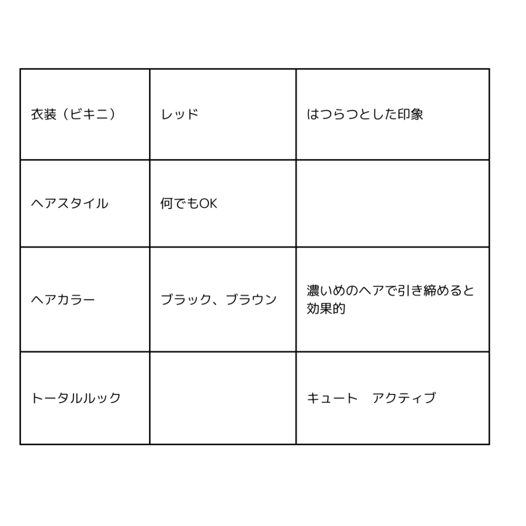 - 衣装: レッドのビキニで、エネルギー溢れるアクティブなルックに。