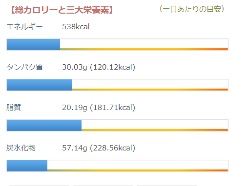 これらのグラフは、1日の必要カロリーが、1,800kcal として算出してます。成人女性体重48kg、活動量が標準的な想定です。性別、年齢、体重、活動量によって変わってきます。自分の1日の必要カロリーが分からない方は、算出してください。こちらの記事を参考にどうぞ。