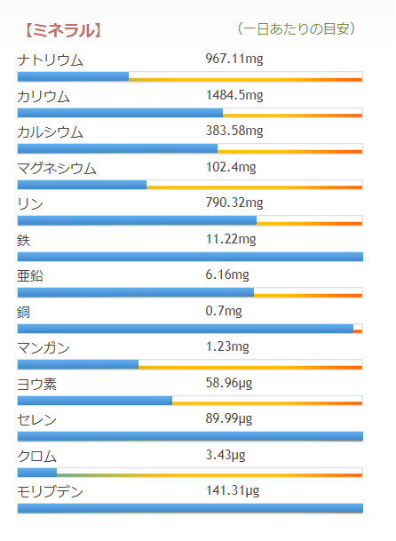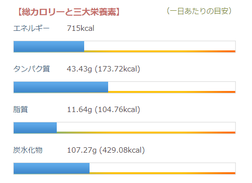 これらのグラフは、1日の必要カロリーが、1,800kcal として算出してます。成人女性体重48kg、活動量が標準的な想定です。性別、年齢、体重、活動量によって変わってきます。自分の1日の必要カロリーが分からない方は、算出してください。こちらの記事を参考にどうぞ。
