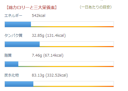 これらのグラフは、1日の必要カロリーが、1,800kcal として算出してます。成人女性体重48kg、活動量が標準的な想定です。性別、年齢、体重、活動量によって変わってきます。自分の1日の必要カロリーが分からない方は、算出してください。こちらの記事を参考にどうぞ。