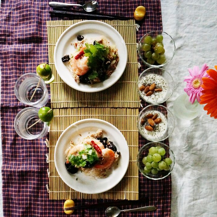 bkf = Yum Un Sen Thai noodle salad, Niagara grape, yogurt topped with almond and Chia seed BREAKFAST